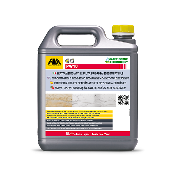 FILAPW10 è infatti l?innovativo prodotto FILA che permette di proteggere, prima della posa, le pietre naturali e i materiali assorbenti dalla risalita di agenti inquinanti e sali che potrebbero macchiare irrimediabilmente il materiale. FILAPW10 è a base acqua e pronto all?uso. Basta applicarlo al sul retro delle lastre o piastrelle, aspettare 24 ore per l?asciugatura e poi procedere con la posa del materiale. La protezione impedirà alle impurità presenti nelle malte cementizie, nel fondo e nel massetto di risalire la superficie e rovinare il materiale. Assicurati a lungo, con FILAPW10, superfici perfette e clienti soddisfatti!