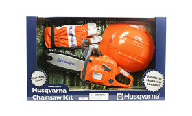 Motosega giocattolo Husqvarna: la confezione include elmetto in plastica e guanti per bambino. Riproduce il suono reale della motosega e simula la rotazione della catena.