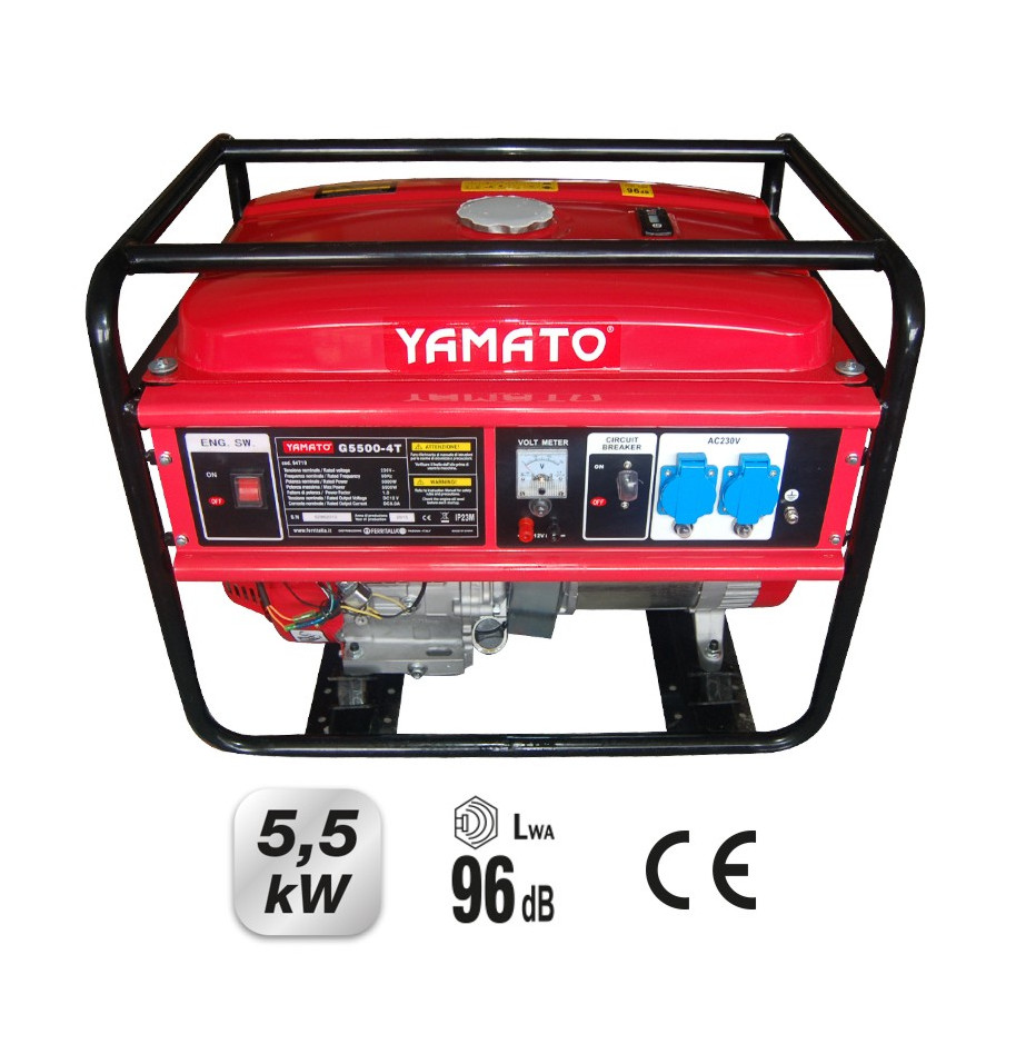 ? Monofase, con regolatore automatico di tensione (AVR), raffreddamento aria, 4 tempi, 230V/50Hz ? Caricabatterie ? 12V/8,3A in uscita ? Con 2x230V VDE prese in uscita