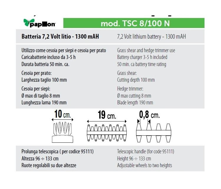Mod. TSC 8/100 N. Batteria 7,2 Volt litio ? 1300 mAH. Utilizzo come cesoia per siepi e cesoia per prato. Caricabatterie incluso da 3-5 h. Durata batteria 50 min. ca. Cesoia per prato: larghezza taglio 100 mm. Cesoia per siepi: diametro max taglio 8 mm. Lunghezza lama 190 mm.