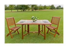 Il tavolo Papavero può essere completato con sedie pieghevoli nello stesso legno di keruing.