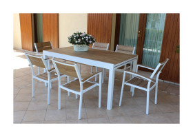 Il tavolo da giardino è realizzato in alluminio color BIANCO, mentre il piano è composto da doghe in polywood LEGNO CHIARO COLOR TEAK, materiali perfetti per resistere all'aperto.