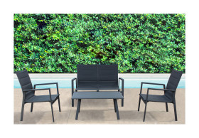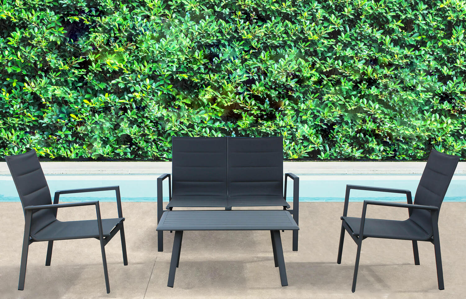 Comode poltrone e un elegante tavolo invitano a trascorre piacevoli ore insieme. Il set in alluminio e textilene piace non solo per l?eleganza ma anche per la sua lunga durata.