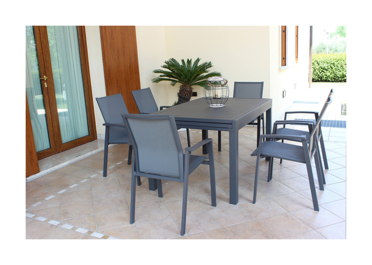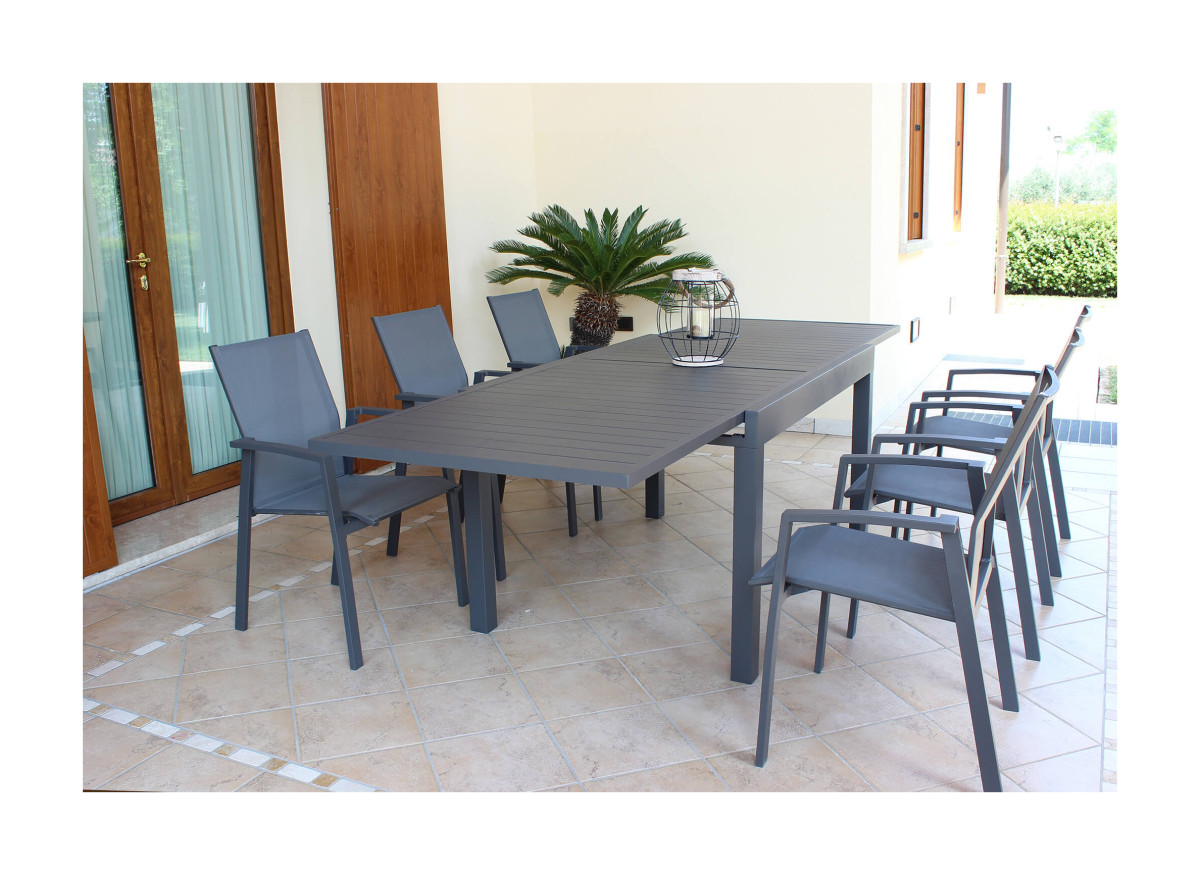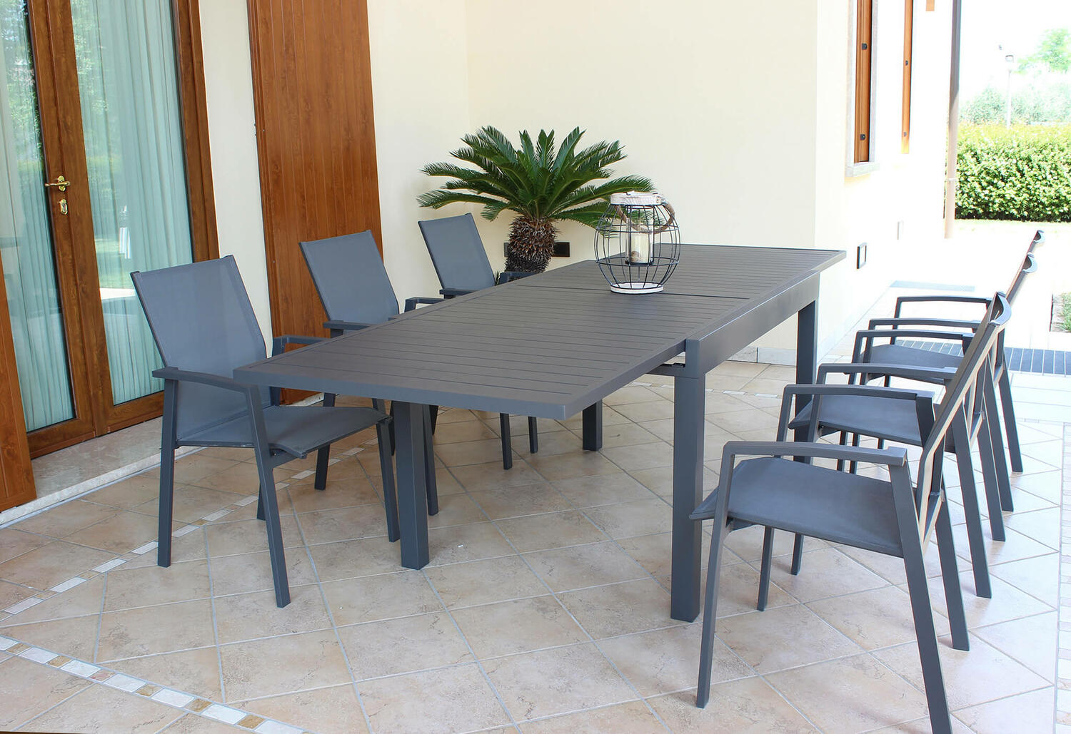Vorreste invitare in giardino i vostri amici e dare loro il giusto comfort? Questo set è il complemento che fa per voi. La finitura e la scelta del bianco rendono il set neutro e ideale per qualsiasi ambiente esterno arredato con gusto moderno, garantendo al contempo stile e ricercatezza. Il tavolo da pranzo rettangolare da 90 cm allungabile fino a 180 cm è realizzato in alluminio ANTRACITE con piano d'appoggio in alluminio ANTRACITE semi-opaco.