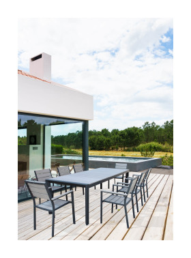 Vorreste invitare in giardino i vostri amici e dare loro il giusto comfort? Questo set è il complemento che fa per voi. La finitura e la scelta del bianco rendono il set neutro e ideale per qualsiasi ambiente esterno arredato con gusto moderno, garantendo al contempo stile e ricercatezza. Il tavolo da pranzo rettangolare da 162 cm allungabile fino a 242 cm è realizzato in alluminio ANTRACITE con piano d'appoggio in polywood.