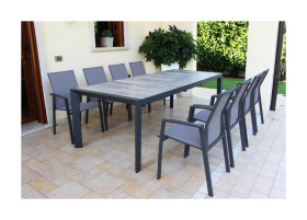 • Questa particolare linea di tavoli da esterno è caratterizzata da un incredibile piano in gres, materiale ceramico a pasta compatta impermeabile, inattaccabile dagli agenti chimici, resistente all'usura e alle intemperie.Oltre alle caratteristiche sopra citate, offre un design estremamente moderno e contemporaneo con un effetto legno estremamente fedele, la struttura è realizzata interamente in alluminio verniciato.