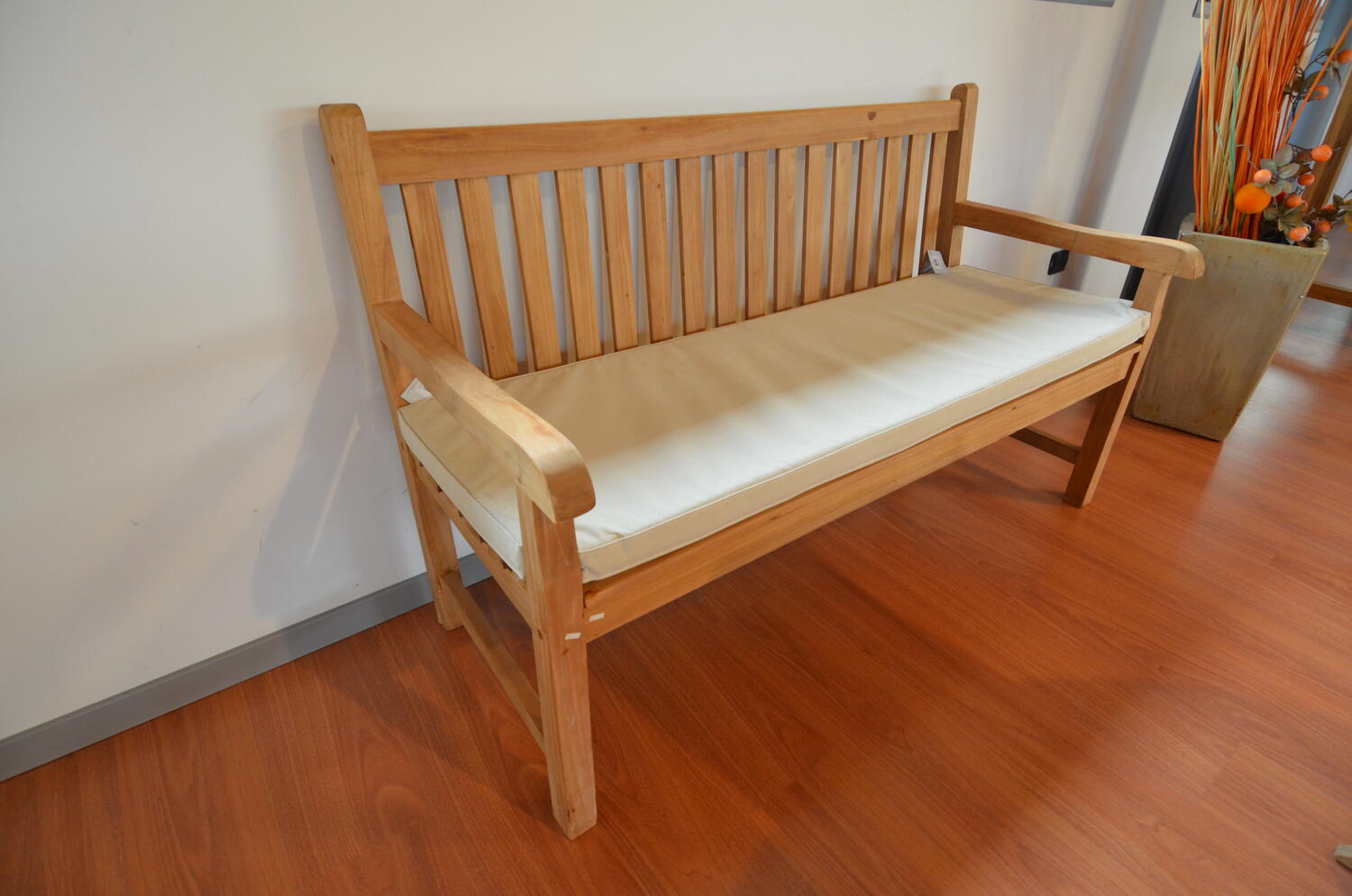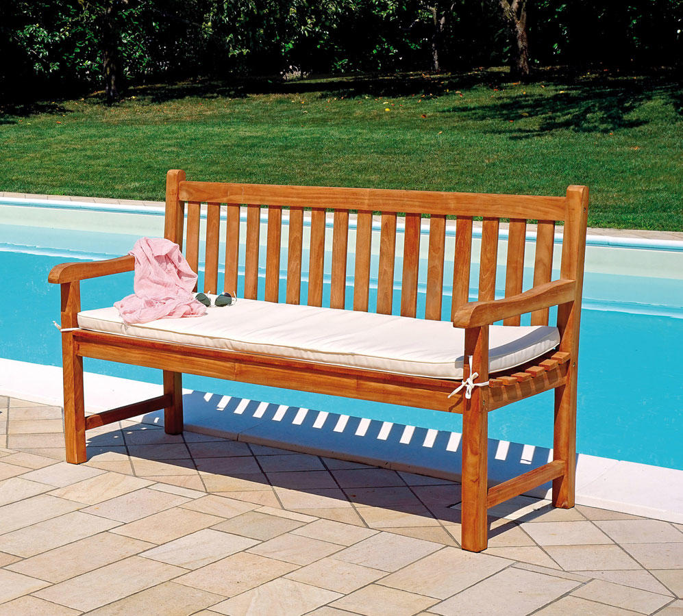 Questa elegante panca da esterno a 3 posti è caratterizzata da un'estetica moderna e funzionale. E' realizzata in Teak, un legno tropicale noto per le sue caratteristiche di resistenza e durevolezza. Cuscino sfoderabile CS 54 nella variante écru venduto separatamente