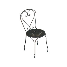Stresa è la sedia da giardino by Greenwood realizzata con struttura in ferro tinto nero con trattamento antiruggine e romantica decorazione retrò a motivi curvilinei. Sedile sagomato con traforatura per lo scolo dell'acqua.