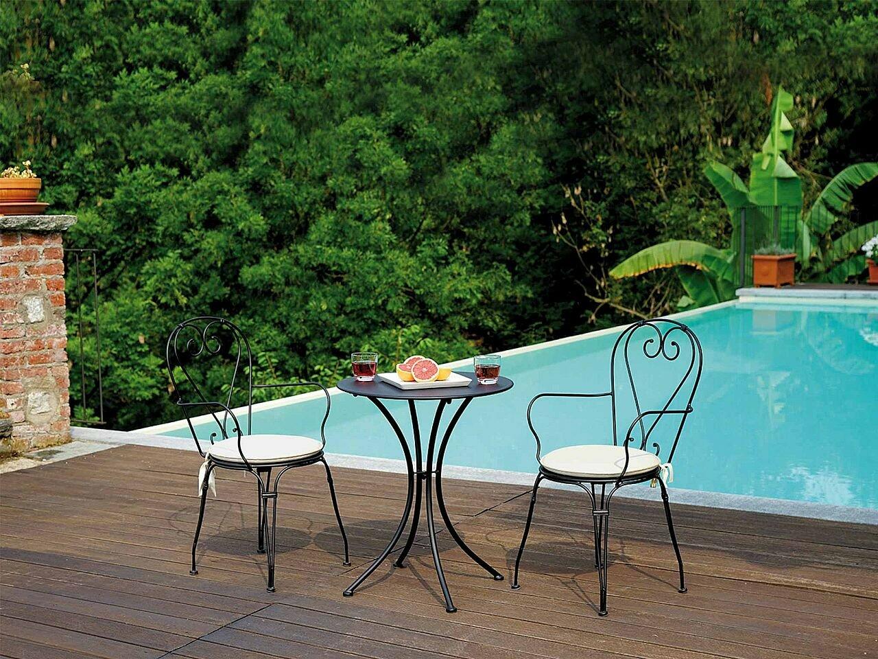 Stresa è la sedia da giardino by Greenwood realizzata con struttura in ferro tinto nero con trattamento antiruggine e romantica decorazione retrò a motivi curvilinei. Sedile sagomato con traforatura per lo scolo dell'acqua.