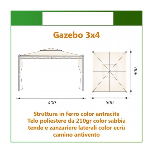 GAZEBO RETTANGOLARE 3 X 4 METRI STRUTTURA IN FERRO CON TELO IN POLIESTERE ECRU?