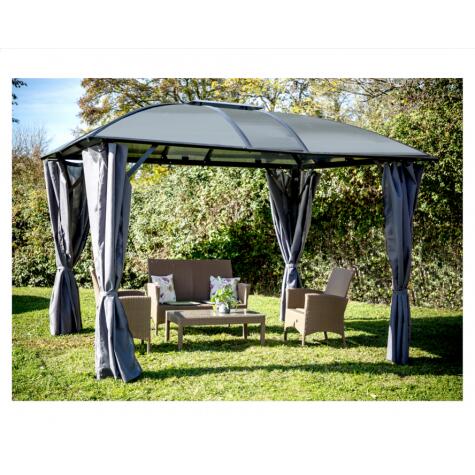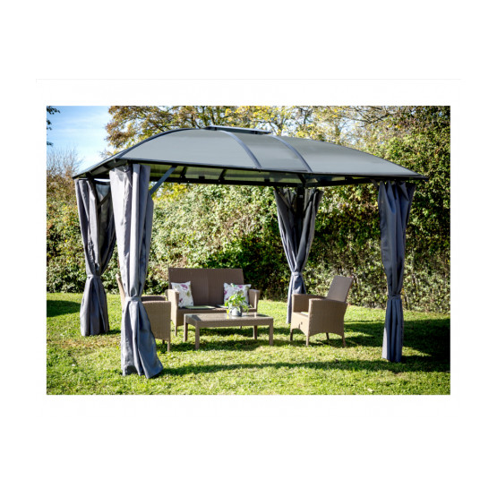Il gazebo GL 3630 AL con tende, combina design, durata e facilità di manutenzione. Il tetto arrotondato da 1/2 mm realizzato con pannelli in policarbonato resistente ai raggi UV da 6 mm protegge dai riflessi dannosi e dai raggi UV del sole pur restando luminoso