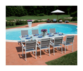 Leggera, resistente e moderna la collezione in alluminio è un prodotto di grande attualità. Disponibili nella elegante versione tradizionale, con un tocco di colore o con l?impronta minimalista di materiali come il vetro temprato e il texilene i tavoli si abbinano con sedie di forma e costruzione diversa. Selinunte tavolo in alluminio allungabile cm 135/270 x 90 con piano in vetro temprato colore milk?Segesta poltrona pranzo in alluminio e texilene imbottito colore grigio cenere.