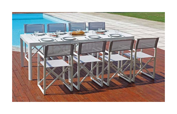 Il tavolo con piano in tecnopolimero a effetto doghe e gambe in alluminio verniciato, si estende in lunghezza per una convivialità da vivere all?aria aperta.