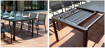 Il tavolo con piano in alluminio a effetto doghe e gambe in alluminio verniciato, si estende in lunghezza per una convivialità da vivere all?aria aperta.