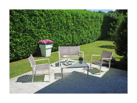 Coffee Set Cefalù composto da: 2 poltrone, 1 divano 2 posti e 1 tavolino 90x50x41 cm con piano in vetro Struttura in ferro epoxy bianco e textilene grigio mélange