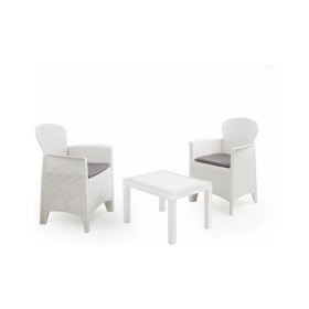 Salottino per interno ed esterno composto da: 2 poltrone ad un posto, 1 tavolino. Colore bianco.