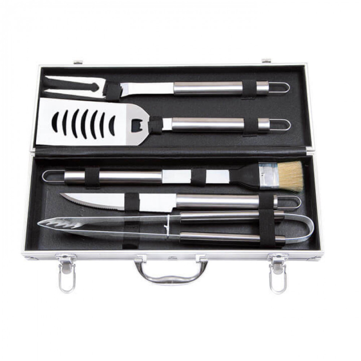 Valigetta in alluminio composta da 5 pezzi, 1 forchettone 40 cm, 1 spatola 42 cm, 1 pinza 41 cm, 1 pennello 41 cm e 1 coltello 38 cm Dimensioni: cm 48,5 x 20 x 7,8
