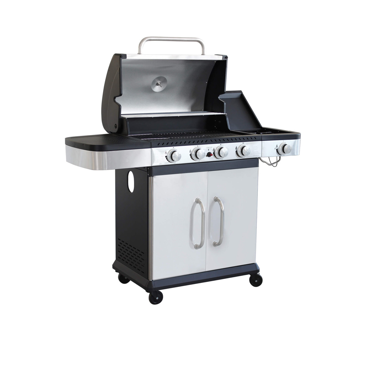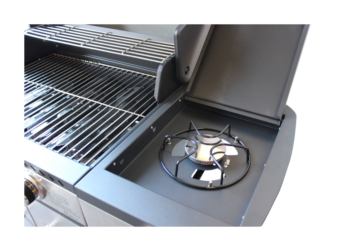Questo barbecue è facile da usare, grazie alle pratiche rotelle per il trasporto, i 4 bruciatori a a gas da 12kW e il comodo fornello laterale con bruciatore da 2kW.
