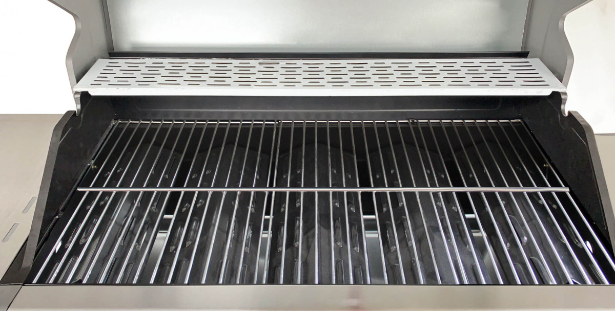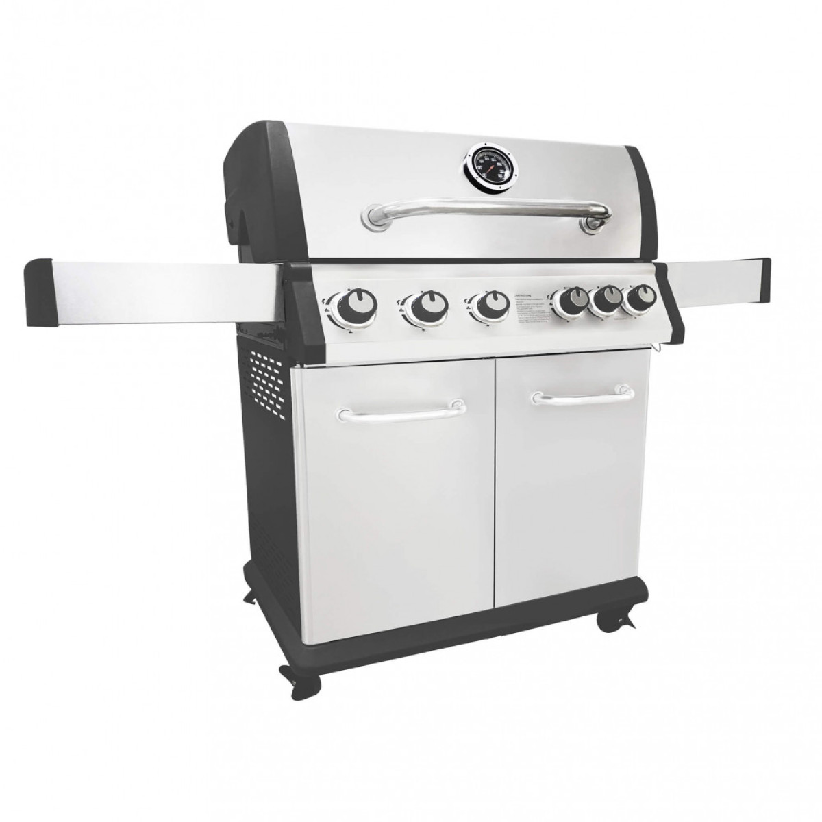 Barbecue in acciaio inox 5 fuochi 2 griglie in ghisa 23x41 e 35x41 + 1 piastra in ghisa 23x41 con fornello laterale e vaschetta di sgocciolamento Dimensioni: cm 144 x 57 x 114 h