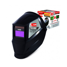 Casco saldatura Telwin Tribe (DIN 11). Maschera automatica a caschetto adatta alla saldatura MMA, MIG-MAG e TIG. Il filtro a cristalli liquidi LCD si oscura automaticamente allo scoccare dell'arco di saldatura e ritorna rapidamente allo stato trasparente allo spegnimento dello stesso, eliminando la necessità di alzare ed abbassare la maschera ad ogni pausa di lavoro e consentendo quindi di operare con le mani libere. Caratteristiche: leggera e confortevole, filtro ad oscuramento automatico fisso, funzionamento a cella solare, protezione filtro in vetro trasparente.