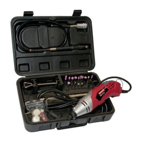 Caratteristiche: Mandrino portafrese ? Potenza 170 watt ? velocità max 35000 ? Bloccaggio albero ? Variatore di velocità ? Dotazione: Valigetta in ABS ? Kit 42 pezzi (10 frese, 2 punte a diamante, 3 aste di connessione, 8 dischi taglio, 4 dischi lucidatura, 4 fasce levigatura, 2 punte trapano, 2 collettori, 1 mola affilatura, 3 carte abrasive, 1 chiave inglese, 1 albero fless., 1 supporto asta telescopica)