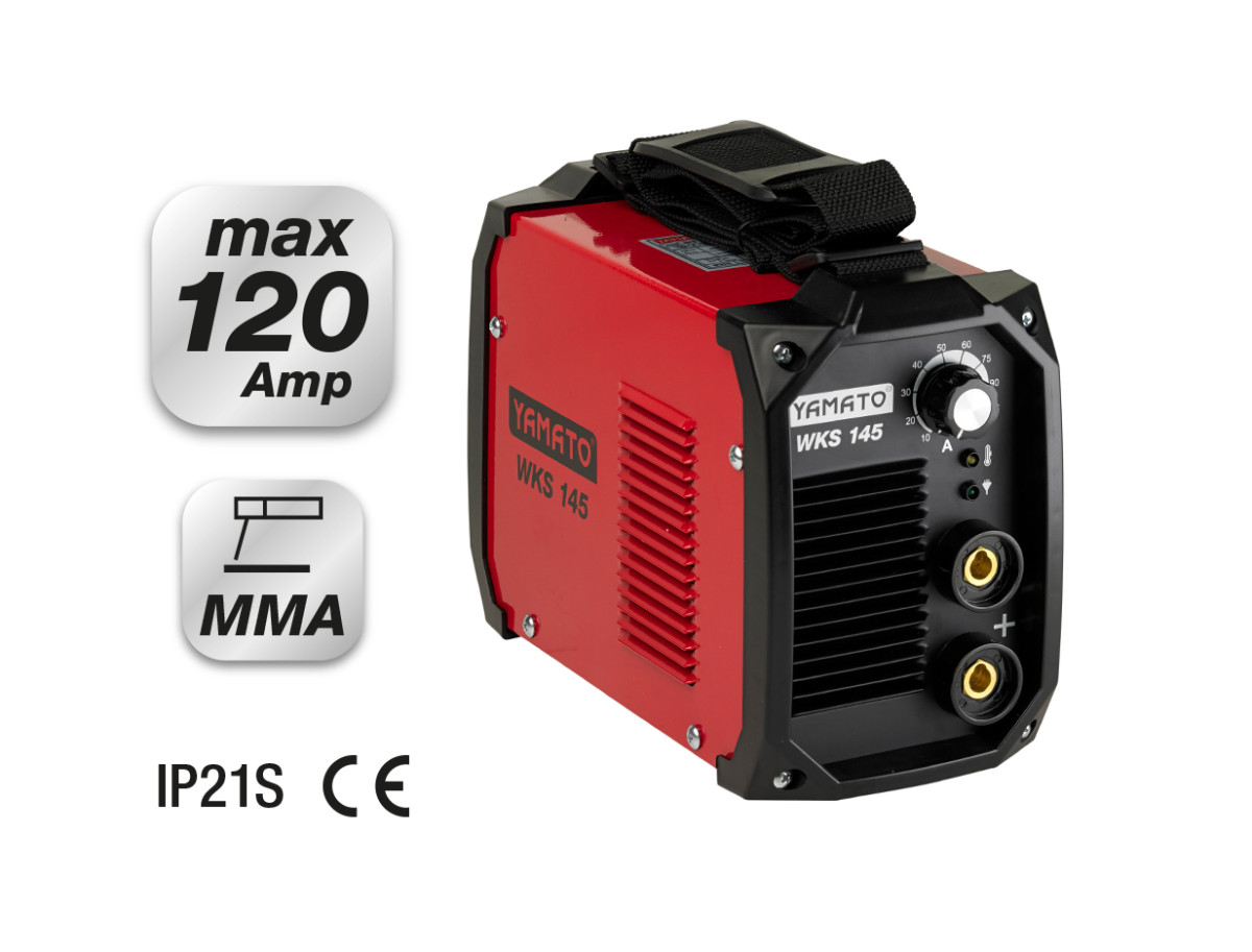Saldatrice inverter "YAMATO" monofase - mod. WKS145 - 120A - 230V per elettrodi da mm.1,0 a 3,2 - basico, rutile, inox, cellulosico - campo di regolazione da 10 a 120 A - classe di isolamento H - grado di protezione IP21S - con ventola e protezione termica - potenza assorbita 5,2 KVA