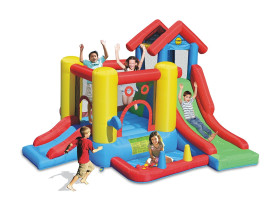 Grande superficie per saltare, arrampicata, scivolo di grandi dimensioni, scivolino, tunnel, canestro, vasca per palline, tiro a segno e lancio agli anelli.