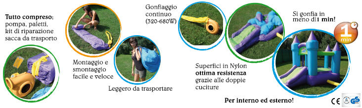 All'interno dei castelli sono presenti delle camere d'aria (inviibili dall'esterno) che garantiscono un flusso d'aria omogeno durante i salti dei vostri bambini.