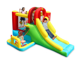 Un vero centro giochi completo ed entusiasmante. Grande superficie per saltare, arrampicata, scivolo di grandi dimensioni, canestro, vasca per palline, tiro a segno e lancio agli anelli.