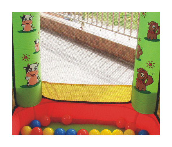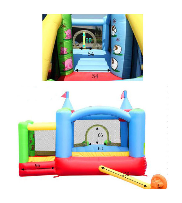 Castello completo di scivolo e vasca per palline (include 30 palline in plastica), canestro, salterello e scivolo inoltre ha dei fantastici disegni di diversi animali carini della fattoria sui 4 pilastri interni.