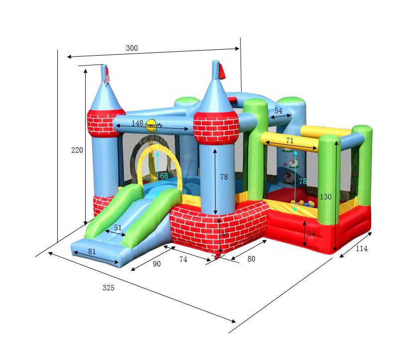 I castelli hanno la superficie extra robusta e le giunture sono doppiamente cucite. La struttura interna è composta da camere d'aria che svolgono la funzione di garantire un flusso d'aria omogeneo su tutta la superfice del castello durante i salti e i giochi dei bambini. I castelli possono essere utilizzati anche con la presenza di piccoli fori (1 - 2 cm), non vi è alcun pericolo e possono essere ripararati con l'apposito kit di riparazioni incluso nella confezione.