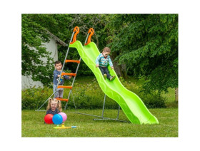 • Scivolo in plastica con struttura portante e rinforzo centrale in metallo. Forma ad onda. Completo di scaletta, corrimano ergonomico e gradini antiscivolo. Prodotto trattato anti UV e conforme alle normative.
