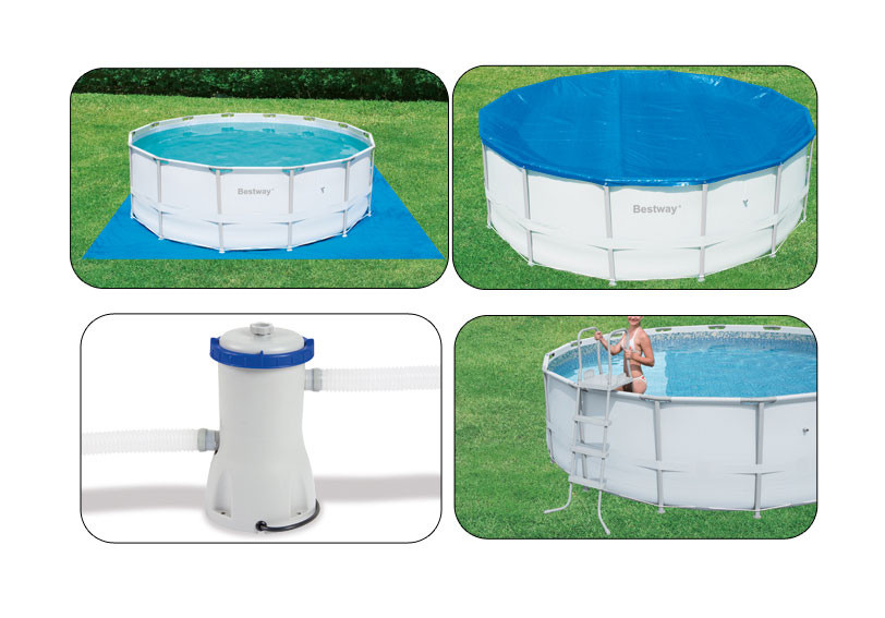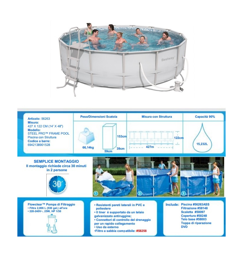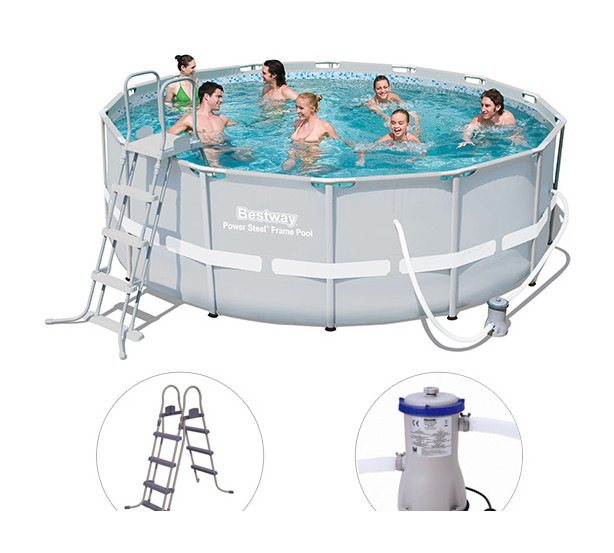 Steel Pro struttura della piscina Bestway ultra rinforzato con circolari diametro 427 centimetri (altezza 122 cm). Il set include la cartuccia di purificazione di 2.006 l / h, panno a terra, copertura, scaletta .Capacità: 15.232 litri.