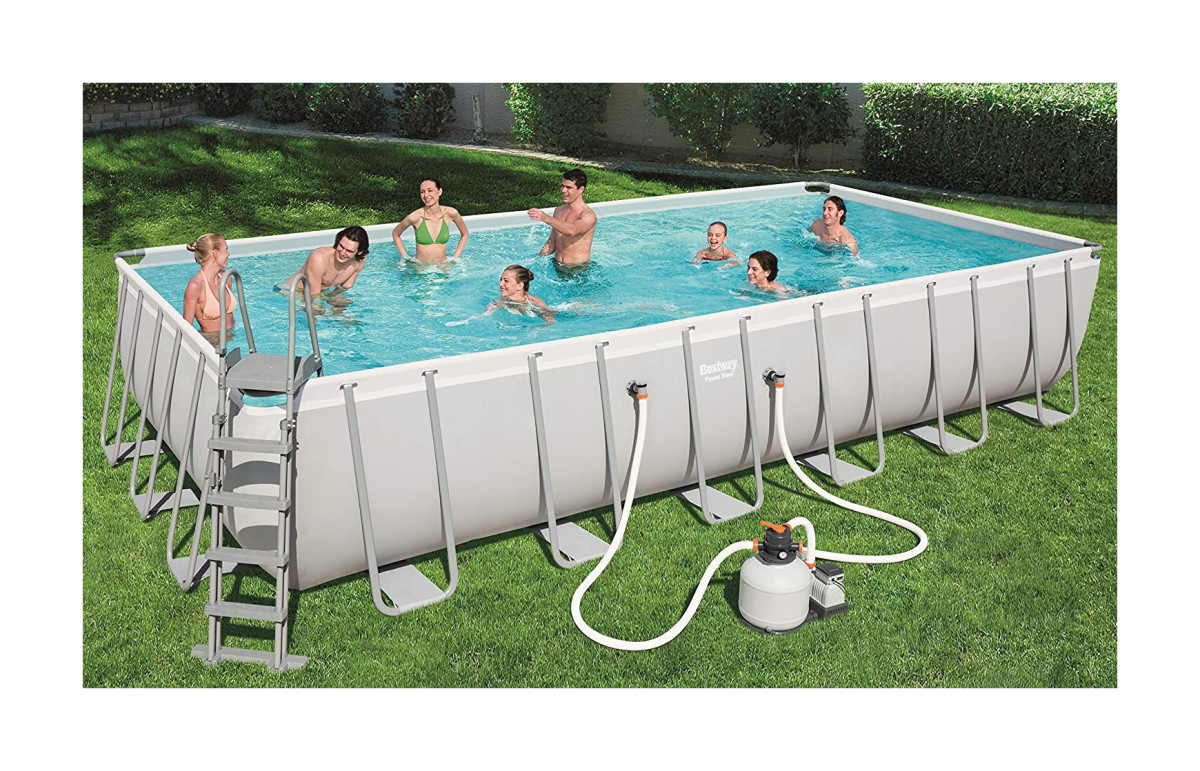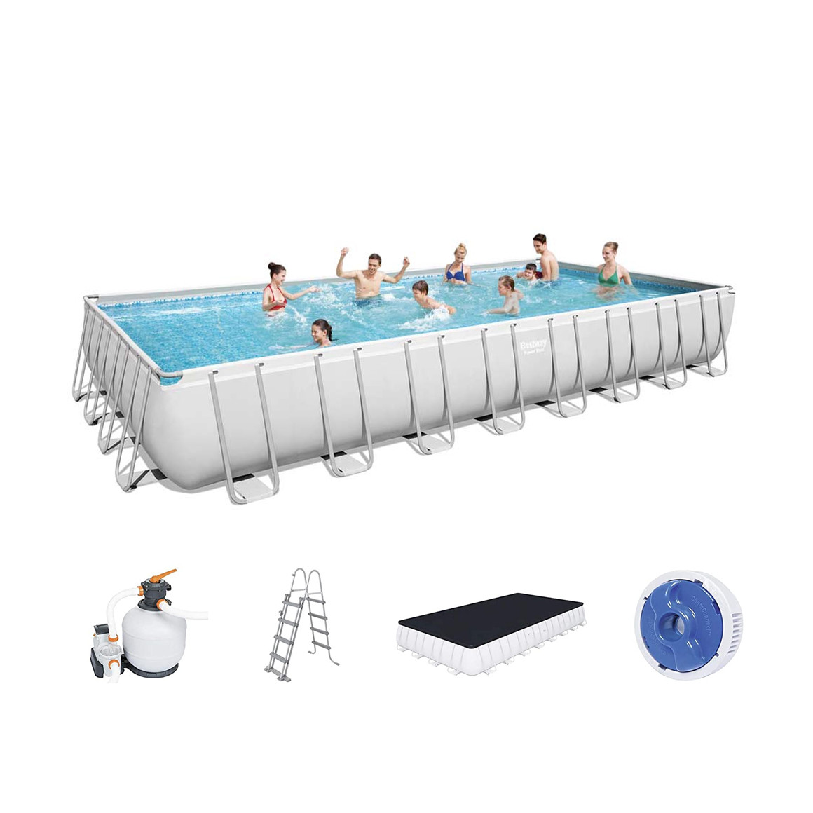 Piscina fuori terra rettangolare Power Steel Frame della Bestway modello 56623, Piscina fuoriterra rettangolare Bestway 56623, struttura di grandi dimensioni che si avvicina moltissimo ad una piscina interrata, la struttura è fatta in metallo galvanizzato antiruggine, i tubi si fissano tra loro con sistema a molla, il telo che contiene l?acqua detto ?liner? è fatto col ?Triplex?, cioè un tessuto formato da tre strati così suddivisi PVC ? poliestere ? PVC, grazie a questa composizione il triplice strato garantisce una notevolissima resistenza.