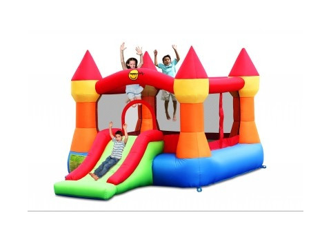 Castello gonfiabile con ampia superficie per saltare, scivolo di piccole dimensioni e reti di protezione su tutti i lati, entrata laterale chiudibile con velcro.