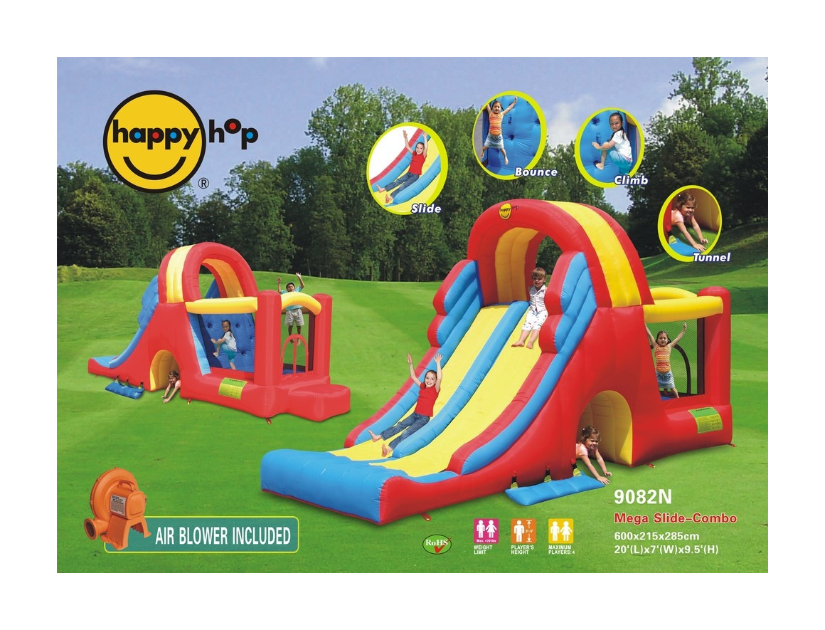 GIOCO GONFIABILE MEGA SCIVOLO COMBO ART.9082 mis. 600 x 215 cm HAPPY AIR MEGA SCIVOLO COMBO Art. 9082 - Gonfiabile Happy Hop con SCIVOLO, TUNNEL, SALTERELLO ed ARRAMPICATA GIOCO GONFIABILE MEGA SCIVOLO ART.9082 2 Mega scivoli, saltarello, arrampicata e tunnel! Nylon e PVC laminato con doppia cucitura per una maggiore resistenza. Sicuri; senza spigoli, senza parti taglienti Certificati CE, TUV e GS BR> CARATTERISTICHE TECNICHE; - Dimensioni; lungh x prof x h; cm 600 x 215 x 285 - Età minima consigliata: 3 anni - Numero max di bambini; 4 - Altezza massima bambino; 150 cm - Peso max supportato; 180 kg - Dimensioni scatola; cm 80 x 45 x 43 - Peso; 32 kg saltarello gonfiabile gioco ad aria giochi gonfiabili vendita gonfiabili gonfiabili bambini parco gonfiabile gonfiabili per feste giostra gonfiabile giostre gonfiabili Il Castello gonfiabile Action Air "Megascivolo Combo" dispone di due grandi scivoli, grande superficie per saltare, parete per arrampicarsi e tunnel. Il tutto su una superficie complessiva di 13 mq. I castelli gonfiabili sono stati studiati per rendere il giardino o la casa più divertente per tutta la famiglia. I giochi gonfiabili hanno molto successo tra i bambini perchè garantiscono un elevato e spettacolare effetto di divertimento e allegria in piena sicurezza grazie al fatto che l'intera struttura non è altro che un enorme cuscino d'aria. I bambini possono saltare, scivolare e arrampicarsi in tutta sicurezza dando sfogo alla loro energia e voglia di giocare grazie alle reti protettive su ogni lato. Sono giochi ideali anche per una festa o un evento particolare, come un compleanno o una ricorrenza speciale. I castelli hanno la superficie extra robusta e le giunture sono doppiamente cucite. La struttura interna è composta da camere d'aria che svolgono la funzione di garantire un flusso d'aria omogeneo su tutta la superfice del castello durante i salti e i giochi dei bambini. I castelli possono essere utilizzati anche con la presenza di piccoli fori (1-2cm), non vi è alcun pericolo e possono essere ripararati con l'apposito kit di riparazioni incluso nella confezione. Il gonfiatore rimane acceso durante tutto il periodo d'utilizzo e gonfia la struttura in appena 60 secondi. Il castello è certificato secondo le norme Europee CE, Certificato T?V GS. Questo articolo non è consigliato per uso commerciale (es:parchi di divertimento). CARATTERISTICHE TECNICHE: Dimensioni: 600 x 215 x 285 cm Dimensioni imballo: 80 x 45 x 43 cm Peso: 33 kg Età max utilizzatore: dai 3 anni su Max numero utilizzatori: 4 bimbi Altezza massima utente: 150 cm Peso massimo supportato: 180 kg CONTENUTO DELLA CONFEZIONE: Gonfiatore elettrico Manuale d'uso Paletti per il fissaggio KIT di riparazione Borsa da trasporto in nylon Certificato GS, TUV, CE Garanzia Action Air 12 mesi Perdite dai buchi delle giunture sono del tutto normali, non trattasi di difetti. Inoltre l'apertura di una cucitura non è coperta da garanzia, ogni cucitura può essere semplicemente cucita a mano con ago e filo resistente.