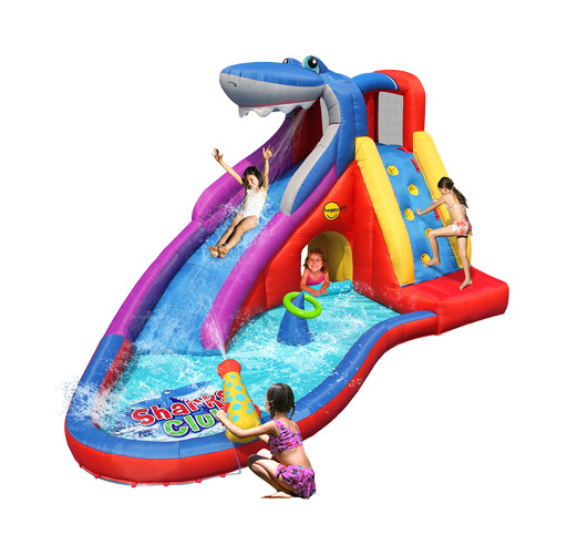 ?Squalo? il nuovo gonfiabile acquatico ricco di giochi. I vostri bambini si divertiranno un mondo grazie alla lunga arrampicata con scivolo, con vasca, valvola spara acqua, tunnel, tiro a segno e l?esclusivo cannoncino!!!!
