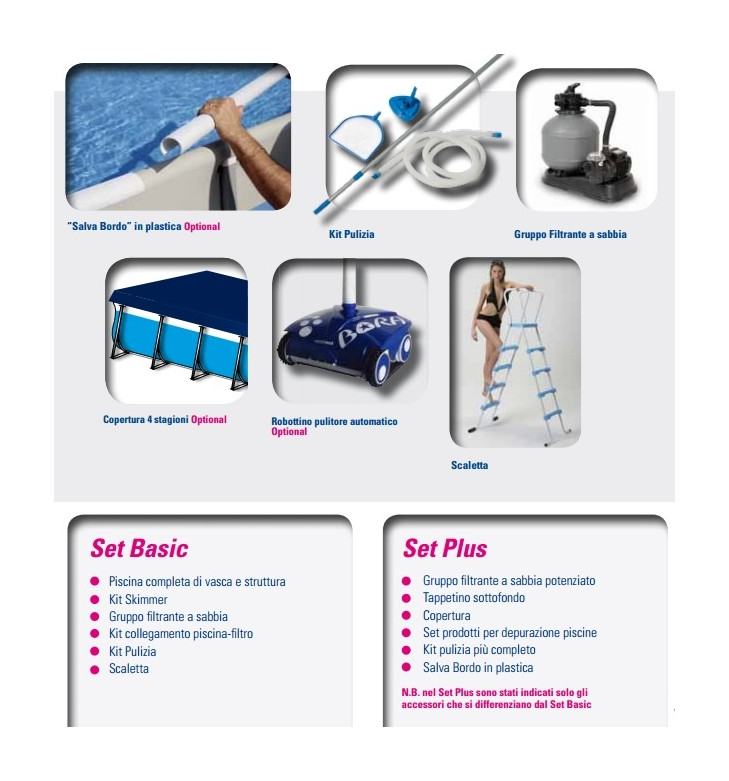 Piscina da giardino completamente made in Italy, completa di kit skimmer fisso (skimmer, bocchette, fascette, teflon), gruppo filtrante a sabbia TF 800, 1 sacco da 25 kg di sabbia per il filtro, kit di collegamento A (tubazioni, raccorderia). Inoltre la piscina è completa del kit di pulizia, comprensivo di canna, asta telescopica e scopa aspirante, oltre alla scaletta step (4+4 gradini con piattaforma).
