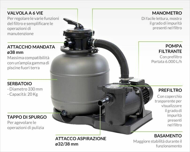 Un investimento che vale sicuramente la pena: il sistema di filtraggio è il cuore della tua piscina fuori terra e contribuisce in modo significativo a garantire che questa sia sempre limpida e pulita. L?uso di un sistema di filtrazione riduce anche l?utilizzo di prodotti chimici per la cura dell?acqua.