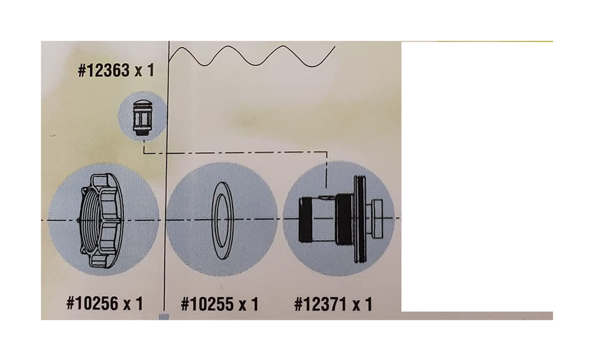 12354 è il Kit valvola aria con beccuccio regolabile per ingresso piscina fuori terra. Il Kit è composto dai seguenti ricambi